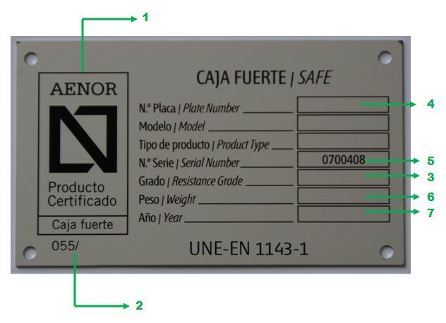 Deberá asegurarse de que en el interior de la caja fuerte aparezca una placa en la que se identifiquen los siguientes datos: